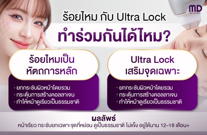 Ultra Lock เป็นเทคนิคยกกระชับหน้าที่พัฒนาจากการร้อยไหมทั่วไป โดยใช้ไหมที่มี “เงี่ยงล็อกหลายทิศทาง” สามารถล็อกผิวได้แน่นขึ้น ดึงได้มากขึ้น เหมาะสำหรับผู้ที่มีผิวหย่อนมากหรือกรอบหน้าไม่ชัดเจน นอกจากนี้ยังช่วยยกเนื้อแก้ม แก้ปัญหาผิวหย่อนบริเวณเหนียงและขอบกรามได้ดี